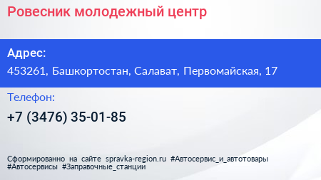 Ровесник, молодежный центр по адресу 453261, Башкортостан, Салават, Первомайская, 17 в дальнейшем Организация, размещена в следующих категориях: