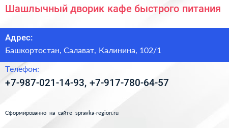 Шашлычный дворик, кафе быстрого питания по адресу Башкортостан, Салават, Калинина, 102/1 в дальнейшем Организация, размещена в следующих категориях: