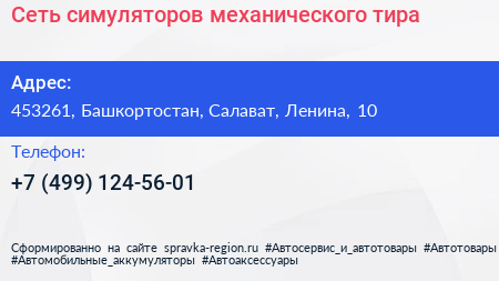 Сеть симуляторов механического тира по адресу 453261, Башкортостан, Салават, Ленина, 10 в дальнейшем Организация, размещена в следующих категориях: