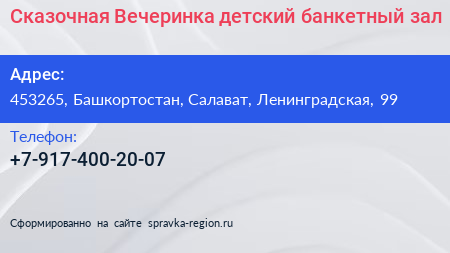 Сказочная Вечеринка, детский банкетный зал по адресу 453265, Башкортостан, Салават, Ленинградская, 99 в дальнейшем Организация, размещена в следующих категориях:
