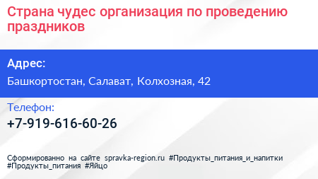 Страна чудес, организация по проведению праздников по адресу Башкортостан, Салават, Колхозная, 42 в дальнейшем Организация, размещена в следующих категориях: