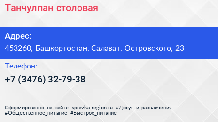 Танчулпан, столовая по адресу 453260, Башкортостан, Салават, Островского, 23 в дальнейшем Организация, размещена в следующих категориях:
