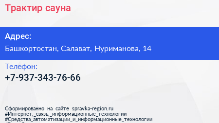 Трактир, сауна по адресу Башкортостан, Салават, Нуриманова, 14 в дальнейшем Организация, размещена в следующих категориях: