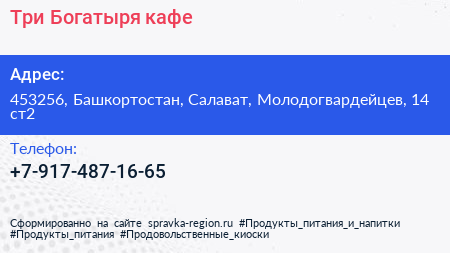 Три Богатыря, кафе по адресу 453256, Башкортостан, Салават, Молодогвардейцев, 14 ст2 в дальнейшем Организация, размещена в следующих категориях: