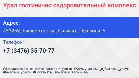 Урал, гостинично-оздоровительный комплекс по адресу 453259, Башкортостан, Салават, Пушкина, 5 в дальнейшем Организация, размещена в следующих категориях: