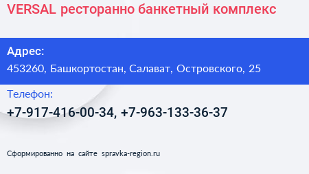 VERSAL, ресторанно-банкетный комплекс по адресу 453260, Башкортостан, Салават, Островского, 25 в дальнейшем Организация, размещена в следующих категориях: