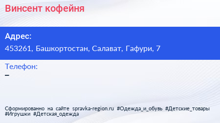 Винсент, кофейня по адресу 453261, Башкортостан, Салават, Гафури, 7 в дальнейшем Организация, размещена в следующих категориях: