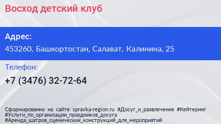 Восход, детский клуб по адресу 453260, Башкортостан, Салават, Калинина, 25 в дальнейшем Организация, размещена в следующих категориях: