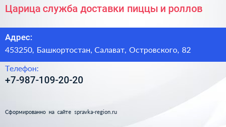 Царица, служба доставки пиццы и роллов по адресу 453250, Башкортостан, Салават, Островского, 82 в дальнейшем Организация, размещена в следующих категориях:
