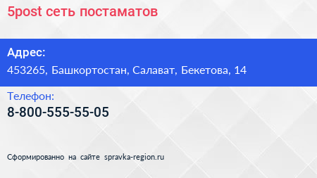 5post, сеть постаматов по адресу 453265, Башкортостан, Салават, Бекетова, 14 в дальнейшем Организация, размещена в следующих категориях: