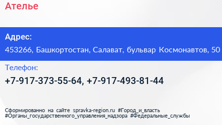 Ателье по адресу 453266, Башкортостан, Салават, бульвар Космонавтов, 50 в дальнейшем Организация, размещена в следующих категориях: