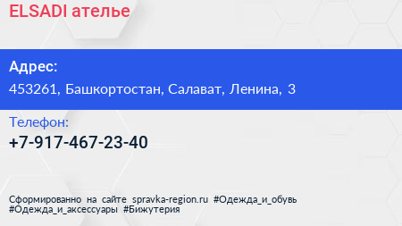 ELSADI, ателье по адресу 453261, Башкортостан, Салават, Ленина, 3 в дальнейшем Организация, размещена в следующих категориях: