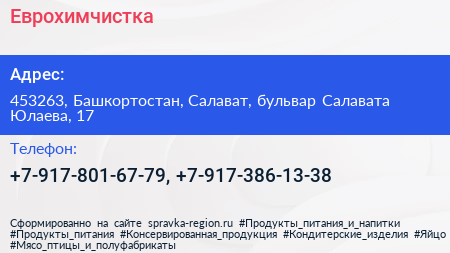Еврохимчистка по адресу 453263, Башкортостан, Салават, бульвар Салавата Юлаева, 17 в дальнейшем Организация, размещена в следующих категориях: