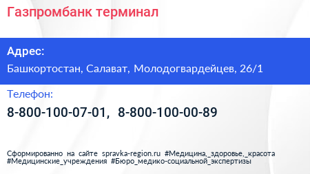 Газпромбанк, терминал по адресу Башкортостан, Салават, Молодогвардейцев, 26/1 в дальнейшем Организация, размещена в следующих категориях: