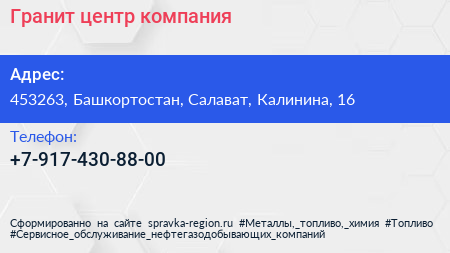 Гранит центр, компания по адресу 453263, Башкортостан, Салават, Калинина, 16 в дальнейшем Организация, размещена в следующих категориях: