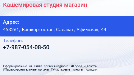 Кашемировая студия, магазин по адресу 453261, Башкортостан, Салават, Уфимская, 44 в дальнейшем Организация, размещена в следующих категориях: