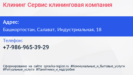 Клининг-Сервис, клининговая компания по адресу Башкортостан, Салават, Индустриальная, 18 в дальнейшем Организация, размещена в следующих категориях: