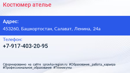 Костюмер, ателье по адресу 453260, Башкортостан, Салават, Ленина, 24а в дальнейшем Организация, размещена в следующих категориях: