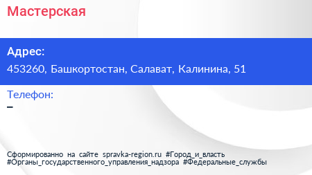 Мастерская по адресу 453260, Башкортостан, Салават, Калинина, 51 в дальнейшем Организация, размещена в следующих категориях: