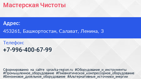 Мастерская Чистоты по адресу 453261, Башкортостан, Салават, Ленина, 3 в дальнейшем Организация, размещена в следующих категориях: