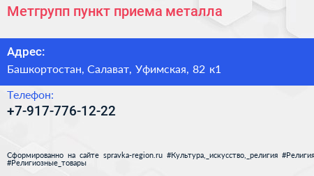 Метгрупп, пункт приема металла по адресу Башкортостан, Салават, Уфимская, 82 к1 в дальнейшем Организация, размещена в следующих категориях: