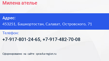 Милена, ателье по адресу 453251, Башкортостан, Салават, Островского, 71 в дальнейшем Организация, размещена в следующих категориях: