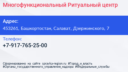 Многофункциональный Ритуальный центр по адресу 453261, Башкортостан, Салават, Дзержинского, 7 в дальнейшем Организация, размещена в следующих категориях: