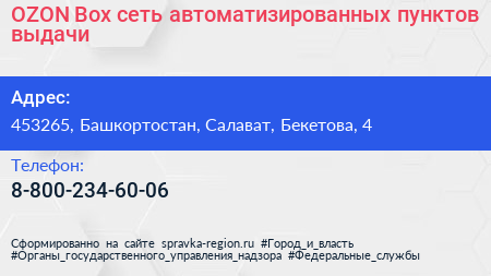 OZON Box, сеть автоматизированных пунктов выдачи по адресу 453265, Башкортостан, Салават, Бекетова, 4 в дальнейшем Организация, размещена в следующих категориях: