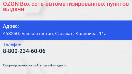 OZON Box, сеть автоматизированных пунктов выдачи по адресу 453260, Башкортостан, Салават, Калинина, 11а в дальнейшем Организация, размещена в следующих категориях: