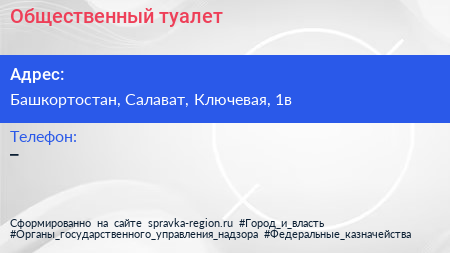 Общественный туалет по адресу Башкортостан, Салават, Ключевая, 1в в дальнейшем Организация, размещена в следующих категориях: