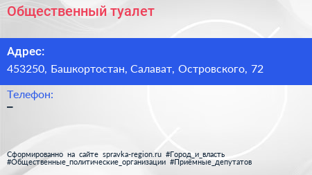 Общественный туалет по адресу 453250, Башкортостан, Салават, Островского, 72 в дальнейшем Организация, размещена в следующих категориях: