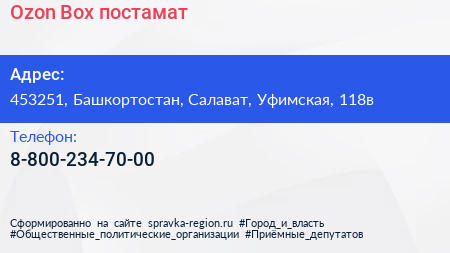 Ozon Box, постамат по адресу 453251, Башкортостан, Салават, Уфимская, 118в в дальнейшем Организация, размещена в следующих категориях: