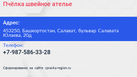 Пчёлка, швейное ателье по адресу 453250, Башкортостан, Салават, бульвар Салавата Юлаева, 20д в дальнейшем Организация, размещена в следующих категориях: