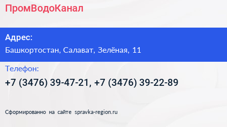 ПромВодоКанал по адресу Башкортостан, Салават, Зелёная, 11 в дальнейшем Организация, размещена в следующих категориях: