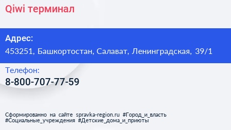 Qiwi, терминал по адресу 453251, Башкортостан, Салават, Ленинградская, 39/1 в дальнейшем Организация, размещена в следующих категориях: