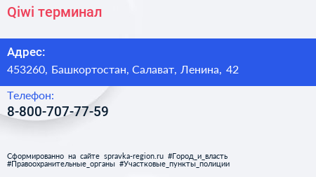 Qiwi, терминал по адресу 453260, Башкортостан, Салават, Ленина, 42 в дальнейшем Организация, размещена в следующих категориях: