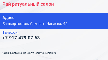 Рай, ритуальный салон по адресу Башкортостан, Салават, Чапаева, 42 в дальнейшем Организация, размещена в следующих категориях: