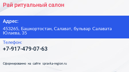 Рай, ритуальный салон по адресу 453265, Башкортостан, Салават, бульвар Салавата Юлаева, 35 в дальнейшем Организация, размещена в следующих категориях: