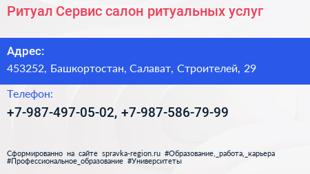 Ритуал-Сервис, салон ритуальных услуг по адресу 453252, Башкортостан, Салават, Строителей, 29 в дальнейшем Организация, размещена в следующих категориях: