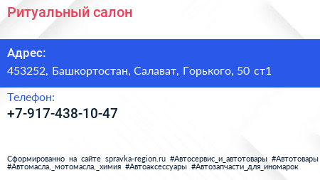 Ритуальный салон по адресу 453252, Башкортостан, Салават, Горького, 50 ст1 в дальнейшем Организация, размещена в следующих категориях: