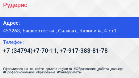 Рудерис по адресу 453263, Башкортостан, Салават, Калинина, 4 ст1 в дальнейшем Организация, размещена в следующих категориях: