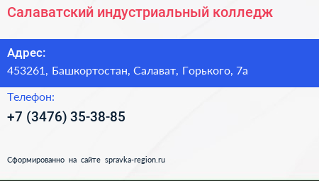 Салаватский индустриальный колледж по адресу 453261, Башкортостан, Салават, Горького, 7а в дальнейшем Организация, размещена в следующих категориях: