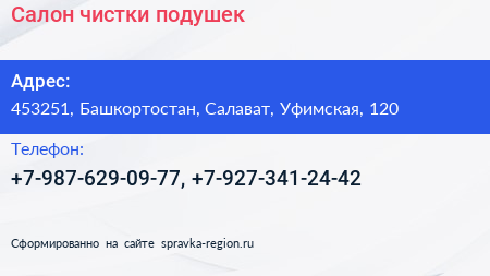 Салон чистки подушек по адресу 453251, Башкортостан, Салават, Уфимская, 120 в дальнейшем Организация, размещена в следующих категориях: