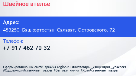 Швейное ателье по адресу 453250, Башкортостан, Салават, Островского, 72 в дальнейшем Организация, размещена в следующих категориях: