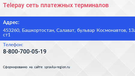 Telepay, сеть платежных терминалов по адресу 453260, Башкортостан, Салават, бульвар Космонавтов, 13а ст1 в дальнейшем Организация, размещена в следующих категориях: