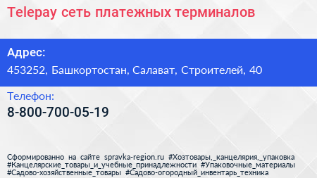 Telepay, сеть платежных терминалов по адресу 453252, Башкортостан, Салават, Строителей, 40 в дальнейшем Организация, размещена в следующих категориях:
