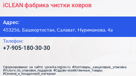 iCLEAN, фабрика чистки ковров по адресу 453256, Башкортостан, Салават, Нуриманова, 4а в дальнейшем Организация, размещена в следующих категориях: