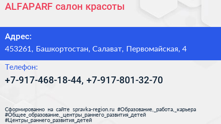 ALFAPARF, салон красоты по адресу 453261, Башкортостан, Салават, Первомайская, 4 в дальнейшем Организация, размещена в следующих категориях: