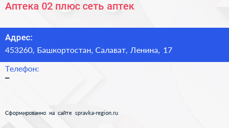 Аптека 02 плюс, сеть аптек по адресу 453260, Башкортостан, Салават, Ленина, 17 в дальнейшем Организация, размещена в следующих категориях: