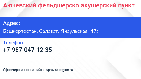 Аючевский фельдшерско-акушерский пункт по адресу Башкортостан, Салават, Янаульская, 47а в дальнейшем Организация, размещена в следующих категориях:
